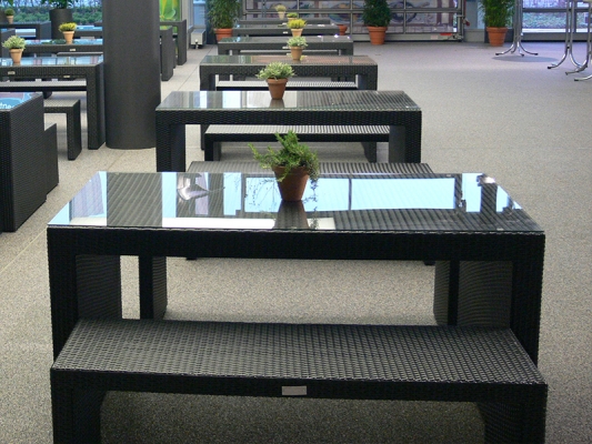 Material: PE-Rattan Farbe: Schwarz Bestehend aus 2 x Bank Serie "Trio" inklusive Polster und 1 x Tisch Serie "Trio" inklusive Glasplatte.
